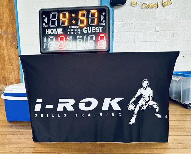 Scoreboard for timed, staff-guided scrimmages used to implement the skills practiced and learned in training. Situational basketball instruction is given as the athletes play.