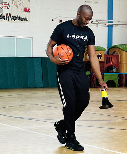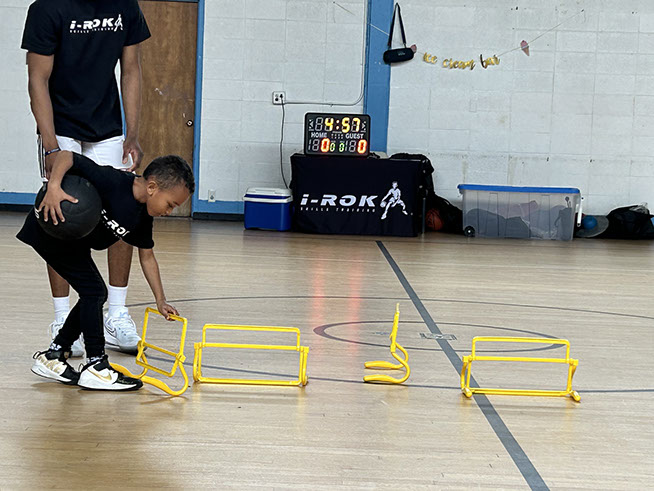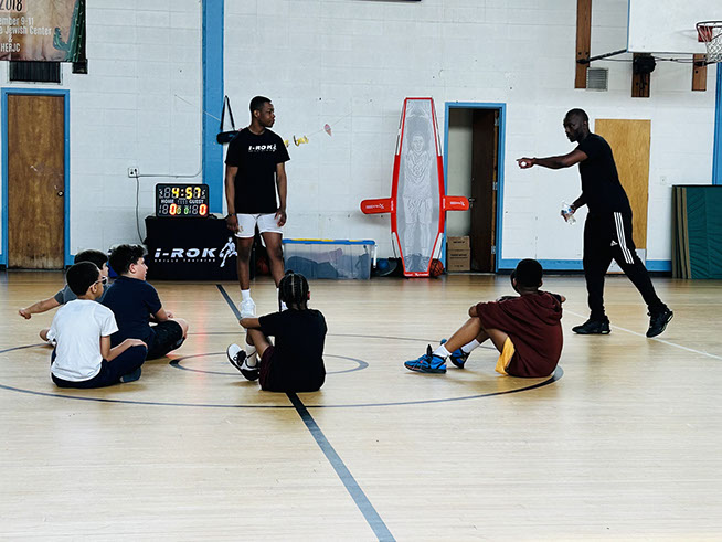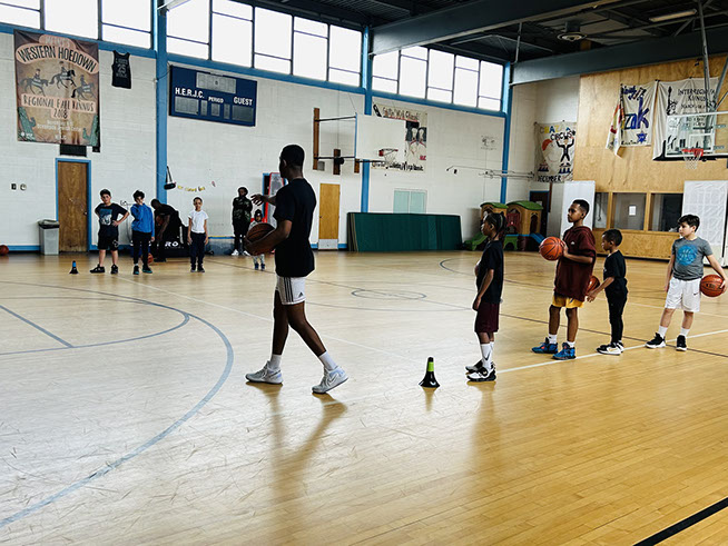 Youth athletes learn basic basket ball skills of dribbling, shooting passing, defense, and team play.